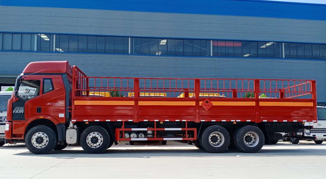 該車適用于運輸危險品為危險貨物運輸車。主要用于運輸具有**容器(瓶)包裝的液化石油氣,丁烷,乙炔,乙烷,丙烷,丁烯,打火機或打火機加油器,二氧化碳,壓縮氧(氮,空氣,氦,氬,氖),類項號:2.1,2.2。該車運輸的介質為2.1項易燃氣體時,車輛采用”易燃氣體”標識牌,運輸的介質為2.2項非易燃無毒氣體時,車輛采用”不燃氣體”標識牌。整車長/軸距/前懸/后懸對應關系為(mm):11995/1950+4550+1350/1460/2685,11995/1900+4500+1350/1500/2745,11995/1900+4200+1350/1500/3045,11995/2**+4000+1350/1460/3085。僅采用底盤子午線輪胎和帶ABS的底盤,該車前輪安裝盤式制動器,前置排氣管,裝配限速裝置,限速79km/h。安裝帶有衛星定位功能的行駛記錄儀。專用裝置為固定用卡槽。側防護和后防護裝置材料材質為Q23**碳鋼,側防護與廂體底部焊接連接,后防護裝置與車架采用焊接連接。后防護截面尺寸(mm):120×50,離地高度為470mm。采用發動機型號CA6DK1-28E5,CA6DK1-32E51,CA6DL1-32E5對應油耗值分別為油耗 (L/**km):43.71,45.5,42.09。ABS系統生產廠家:浙江萬安科技股份有限公司,型號:VIE ABS-Ⅱ。隨底盤選裝駕駛室。后軸采用空氣懸架。 該車后軸為采用空氣懸架. |